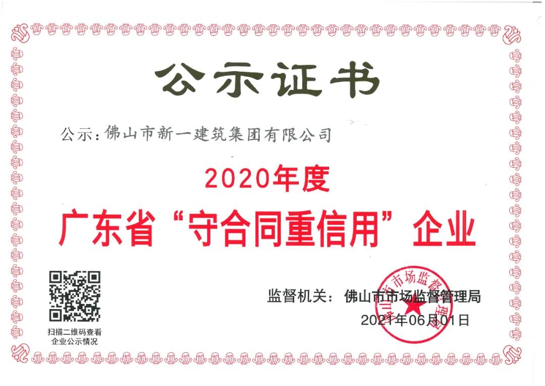近日,佛山市新一建筑集團有限公司憑借完善的信用體系建設(shè)與規(guī)范的合同管理機制,榮獲“廣東省守合同重信用企業(yè)”稱號。這是佛山市新一建筑集團有限公司一直以來堅守誠信經(jīng)營理念與優(yōu)質(zhì)服務(wù)意識而取得的重要成果,也體現(xiàn)了新一建這些年來積累的良好社會信譽。